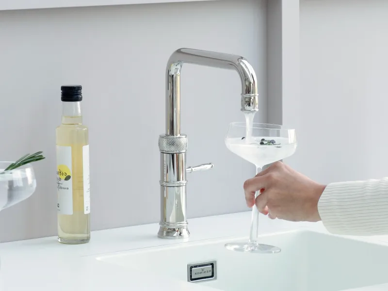 WymaganeCUBE można zainstalować na dole szafki kuchennej, tuż obok zbiornika Quooker. Wyposażony jest w filtr, który oczyszcza wodę do jakości wody butelkowanej, oraz cylinder CO2, który dostarcza do 60 litrów zimnej gazowanej wody bezpośrednio z kranu Quooker.